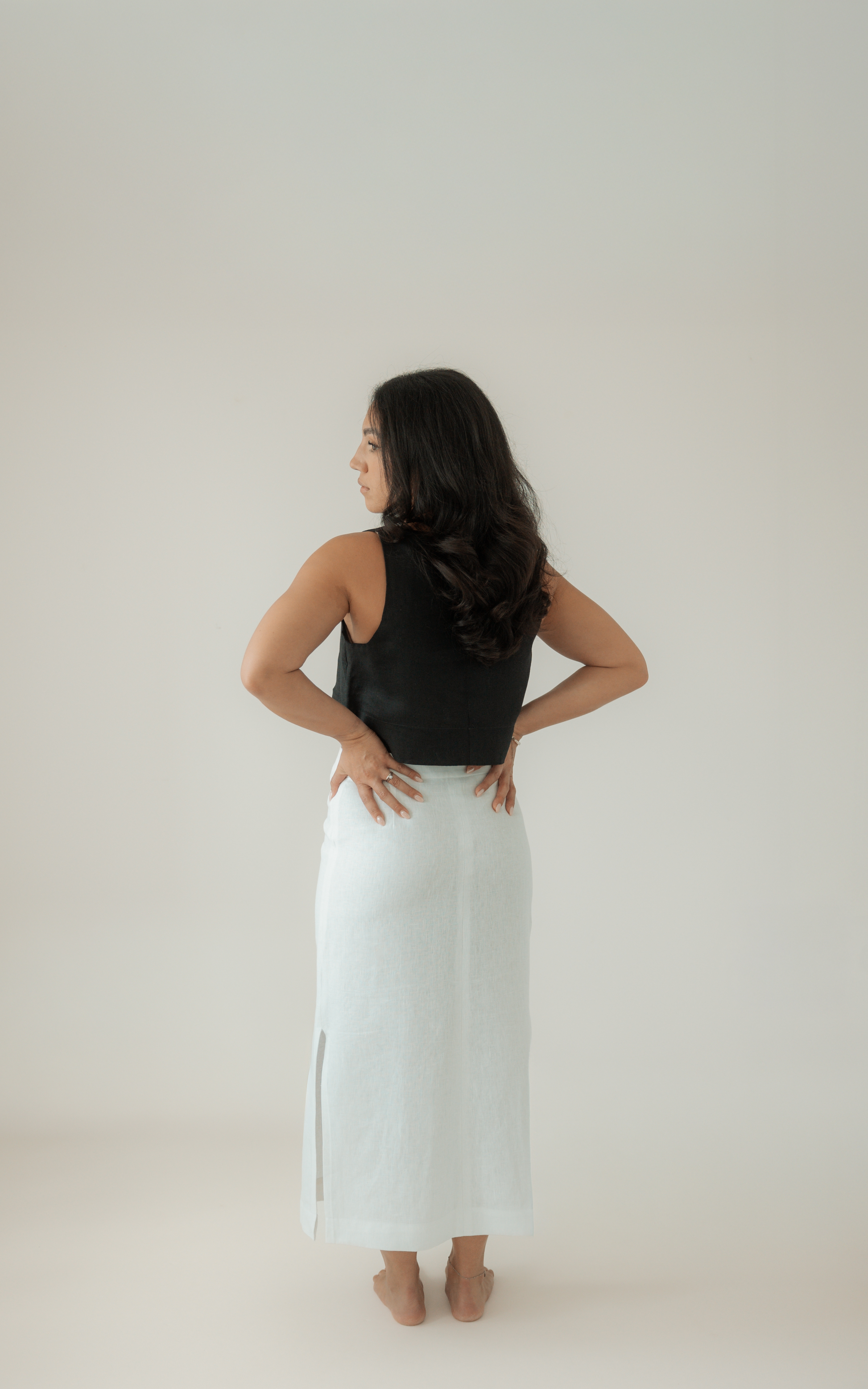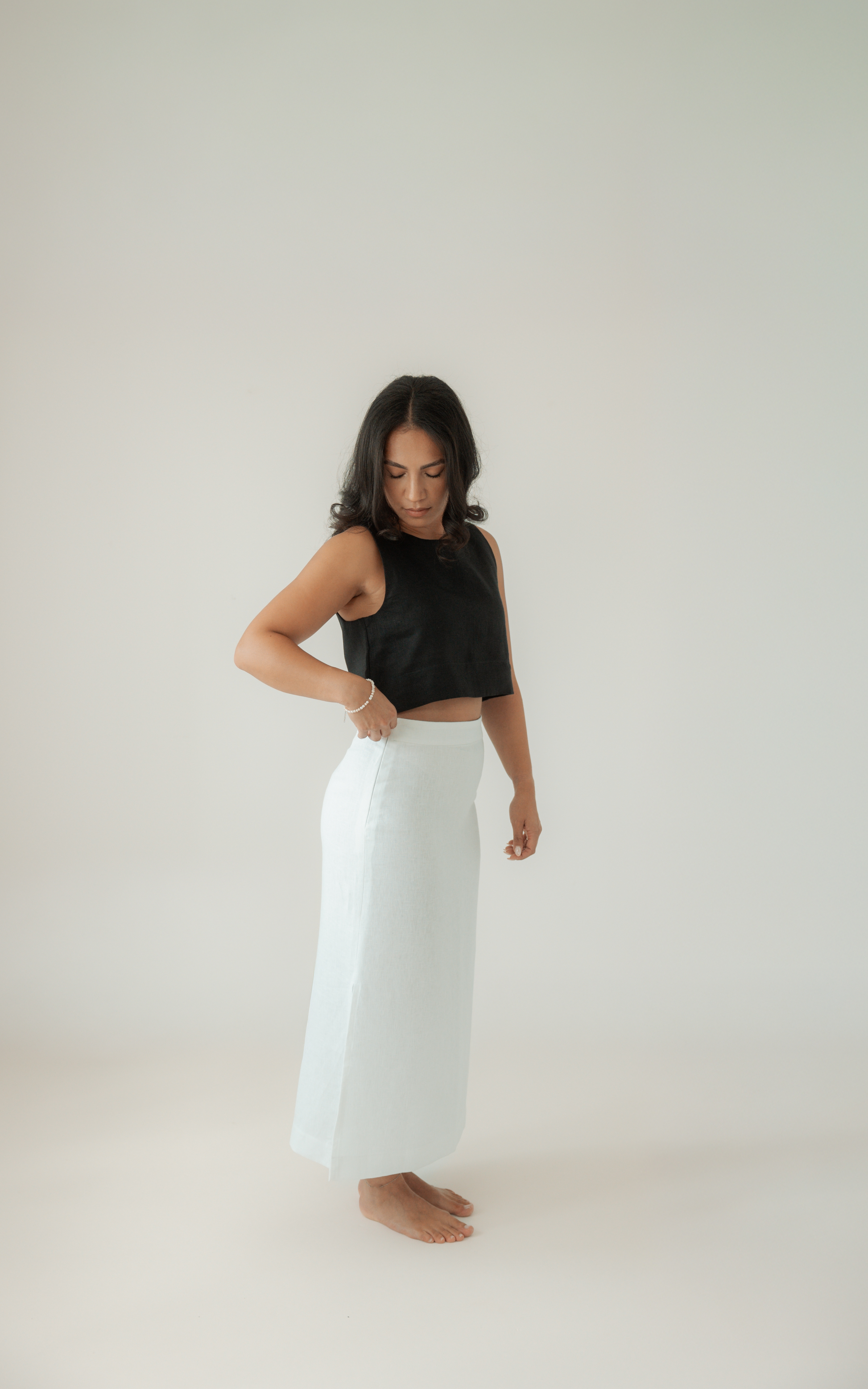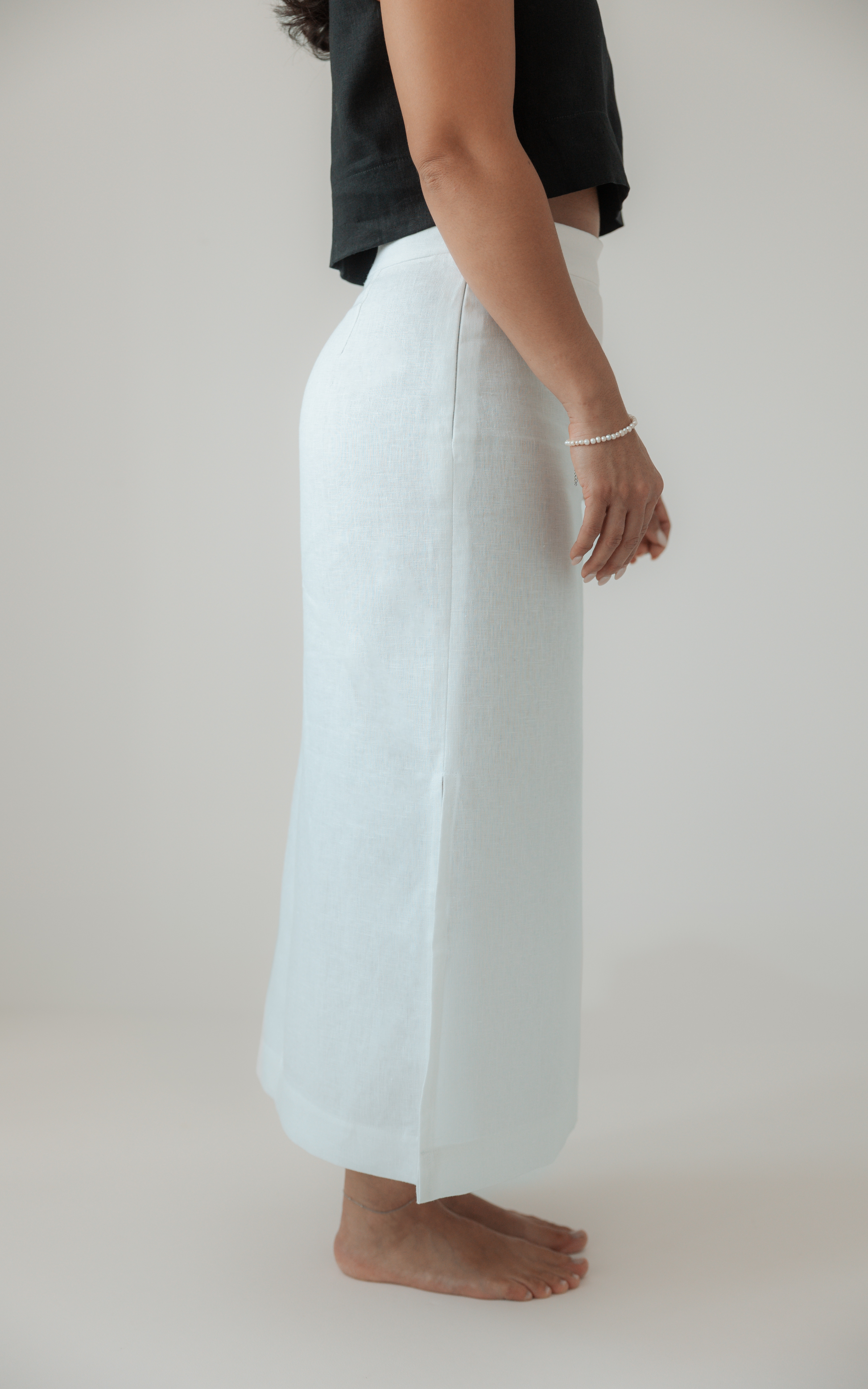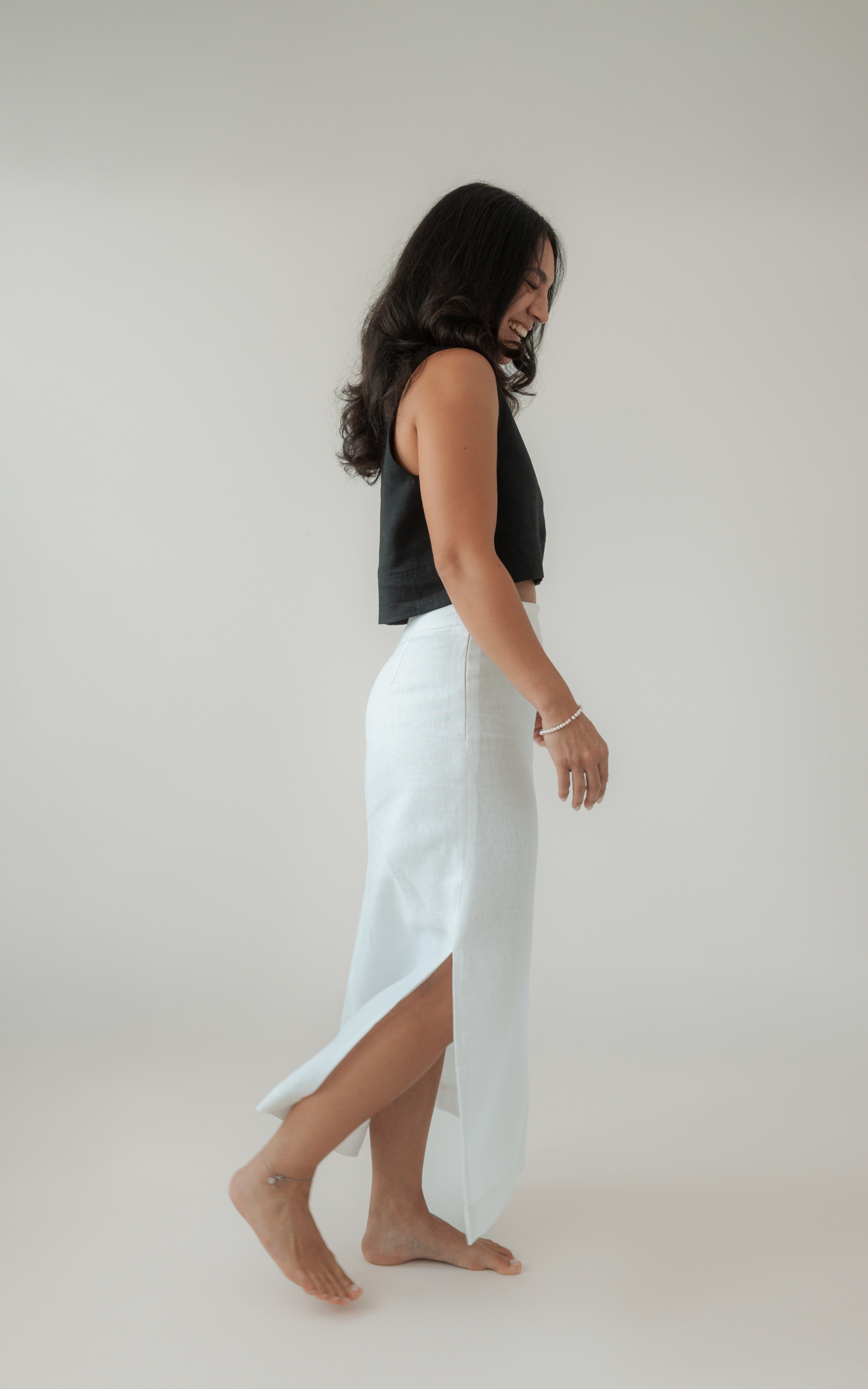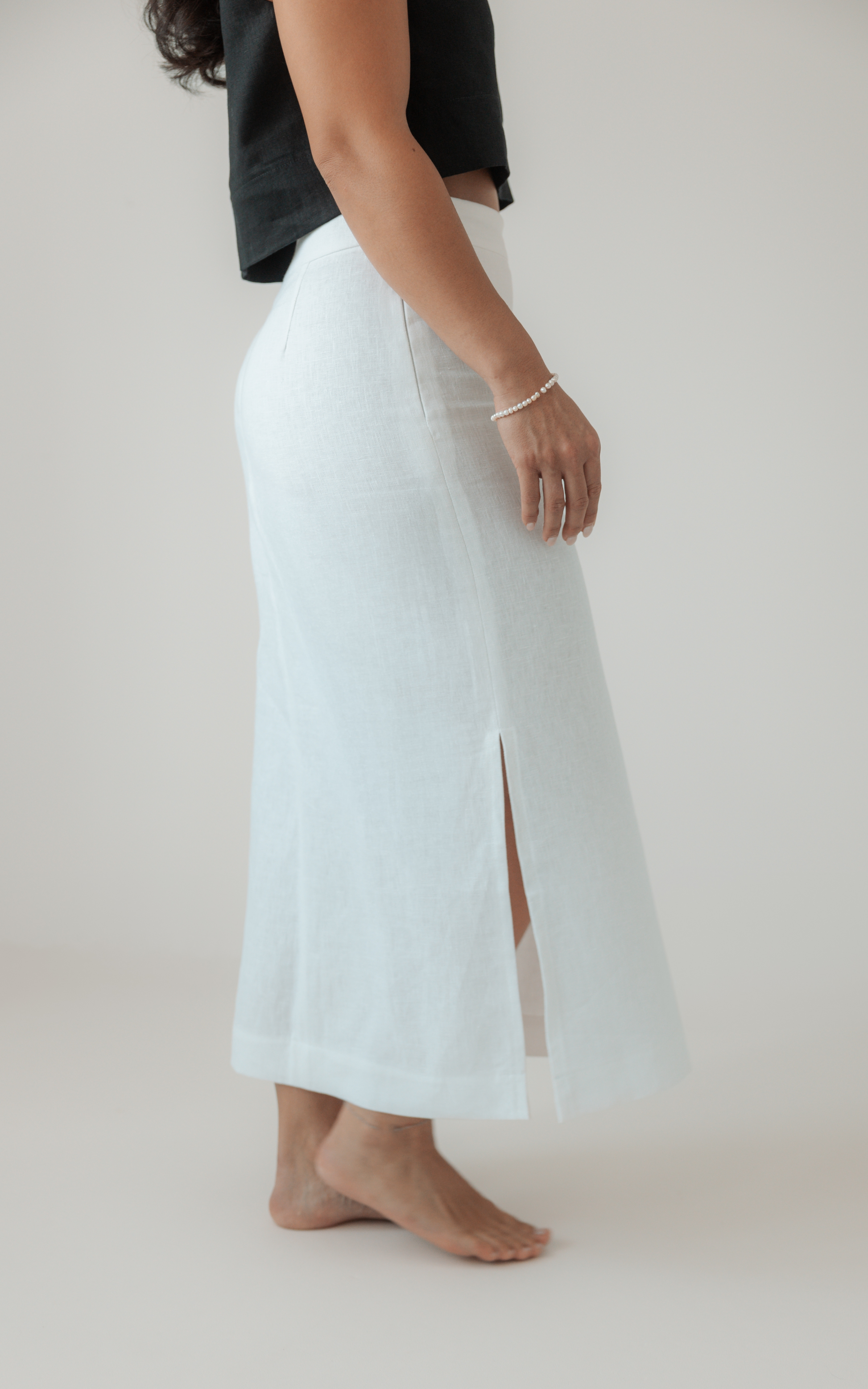 Unser Alba Leinenrock ist ein hochgeschnittener, gerade fallender Rock mit einer dezenten A-Linie. Er hat seitliche Gehschlitze für und ist aus leichtem, atmungsaktivem Leinen gefertigt. Der Rock ist in klassischem Weiß erhältlich und lässt sich vielseitig mit allen Basics deiner Garderobe kombinieren.